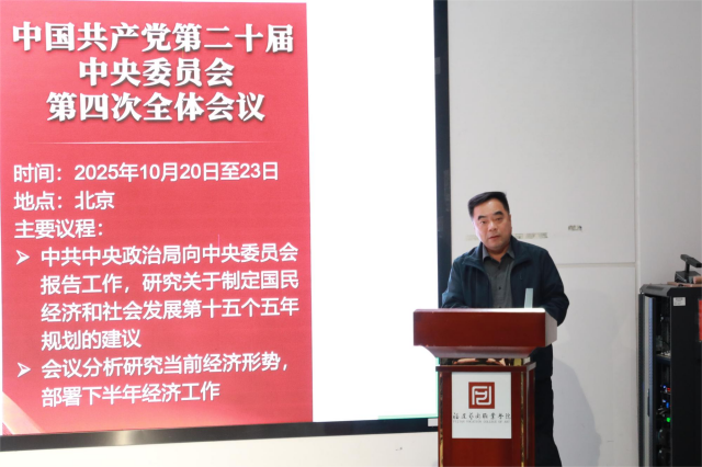陈晟以党的二十届四中全会概况为切入点,系统梳理《中共中央关于制定国民经济和社会发展第十五个五年规划的建议》的核心要义;围绕国际国内形势,通过生动的案例和翔实的数据,深入阐释我国经济发展面临的机遇与挑战;回顾“十四五”时期的发展历程,着力强调文化事业在提升国际影响力、丰富人民精神生活等方面取得的丰硕成就;聚焦“十五五”时期经济社会发展的谋篇布局,结合学校办学实际与发展定位,指明未来五年的奋斗方向与主要目标。