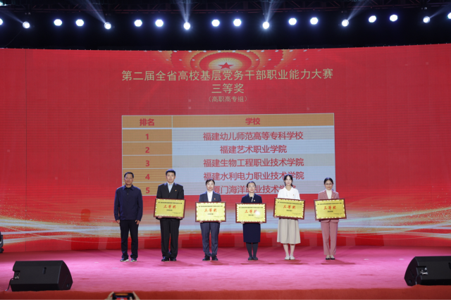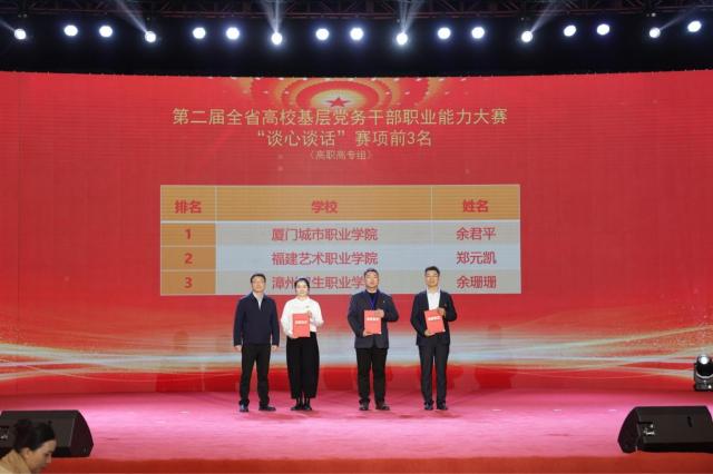11月28日,由省委教育工委主办的第二届全省高校基层党务干部职业能力大赛在福建师范大学圆满落幕。福建艺术职业学院选派的郑元凯、修莹锟、肖肖三位党务干部凭借扎实的专业功底和出色的临场发挥,荣获高职组团体三等奖、“谈心谈话”赛项总分第一名。其中,郑元凯同志获“谈心谈话”赛项单项奖。