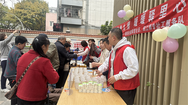 活动当天,志愿者们提前抵达长者食堂,迅速进入服务状态,与社区工作人员分工协作、默契配合。志愿者们化身“孝心使者”,亲手为到场的老人们送上热气腾腾的拗九粥,每一碗都承载着对长辈的美好祝福,也延续着拗九节“掼粥尽孝”的传统习俗。