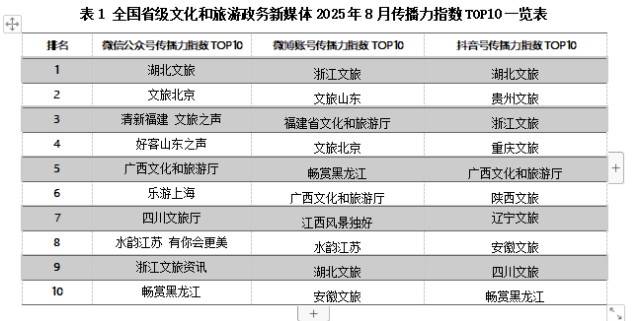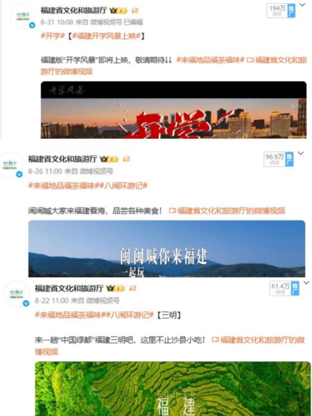 从8月1日起至31日止,@福建省文化和旅游厅 共发布微博548条,总阅读量达3384万,转发数有1.41万余次,评论数有2.58万余次,点赞数5.15万次。在文旅产业指数实验室发布的全国省级文化和旅游政务新媒体2025年8月传播力指数TOP10榜单上,@福建省文化和旅游厅 微博账号排名第三。