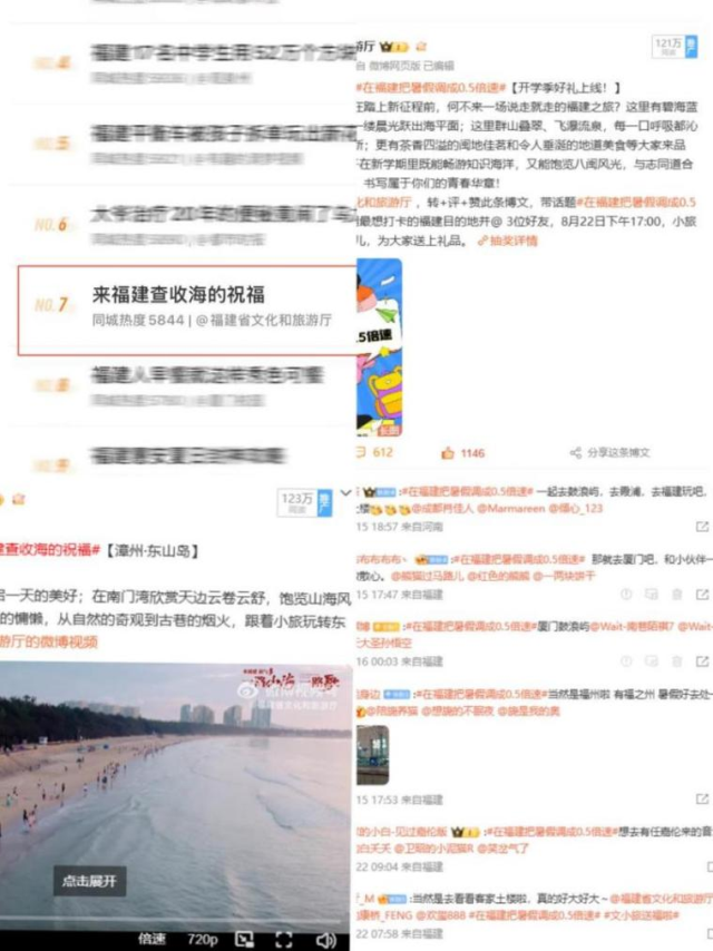 本月微博运营工作围绕“暑期出行”“夏日福建海滨玩法”“开学季”三大核心主题展开。一是滨海与开学主题实现“双百万”传播。“夏日福建海滨玩法”相关话题 #来福建查收海的祝福# 表现突出,其单条视频博文阅读量达百万级别,凭借高讨论度跃居微博同城热搜榜,成功实现破圈传播,收获大量网友互动反馈;同期推出的 “开学季” 主题活动同样成效显著,阅读量突破百万,吸引超千位网友积极参与互动,持续推动账号品牌影响力与人群覆盖范围的提升。二是多个热点追踪实现“百万”传播,8 月紧密贴合实时动态,围绕 “开学风暴”“初秋丰收”“福建文旅推荐” 等重点内容发力,相关话题均取得超百万阅读量,用户互动活跃度显著增强,收获广泛正面反馈,有效实现传播广度与福建文旅品牌影响力的同步提升;同时,账号还紧扣开渔节、初秋时节等节点,深入挖掘福建本土美食文化内涵,并结合 “演唱会经济”“初秋福建风光” 等热门话题推出多轮主题策划,将地域特色与季节性热点深度融合,显著提升了内容的时效性与传播覆盖面。