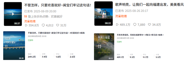 八月,福建省文旅厅视频团队累计发布作品599条,爆款作品数量呈现井喷式增长,全平台超百万级曝光量作品达14条,《不管怎样,只要欢喜就好!》作品在快手平台播放量突破500万人次!当月点赞量超万次作品达33条,较上月总量激增50%!其中,快手平台表现抢眼,共有4条视频作品点赞量超10万,2条点赞量突破30万,创造了现象级的传播效果。