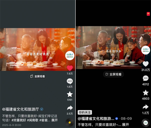 2025年8月,福建省文化和旅游厅深耕平台热点趋势与内容创作,结合本省文化,积极借势网络热点,成功打造多款现象级爆款作品,用户互动量大幅增长,多项数据再创新高,在全国文旅政务抖音号传播力指数榜单上福建省文化和旅游厅抖音号三个月内实现排名“三连升”,八月跃居全国第11名,创今年最好成绩。