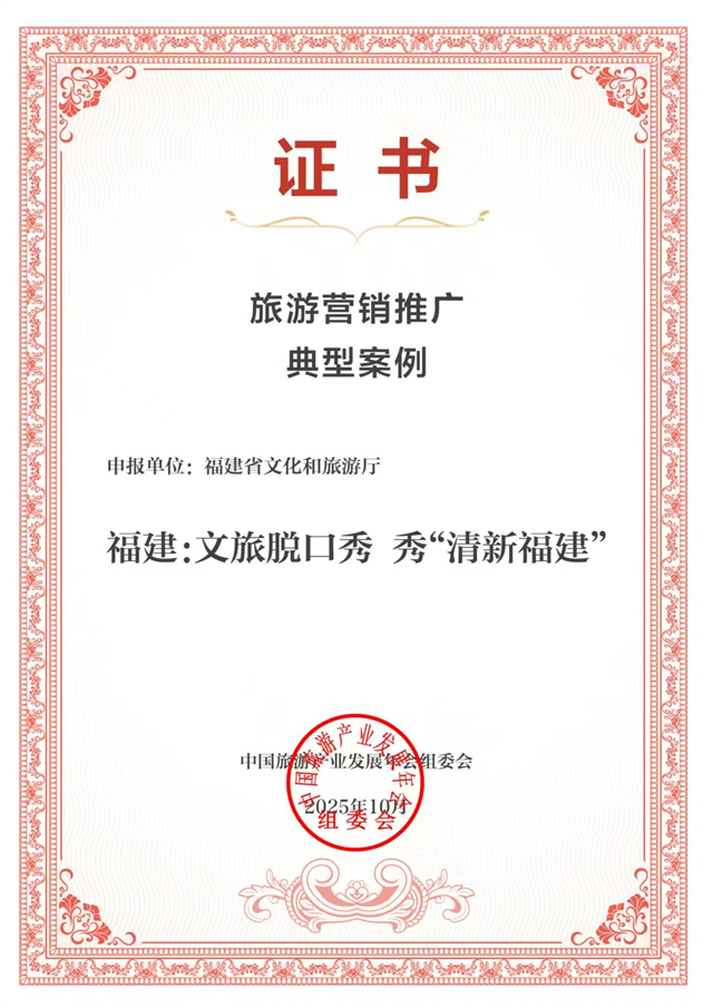 会上,主办方揭晓了“2025中国旅游产业影响力案例”,福建省文化和旅游厅报送的《福建:文旅脱口秀 秀“清新福建”》入选“旅游营销推广典型案例”;福州市文化和旅游局报送的《福州上下杭:培育“杭肆”品牌 用旅游激发非遗生命力》入选“旅游促进非遗传承与发展典型案例”。