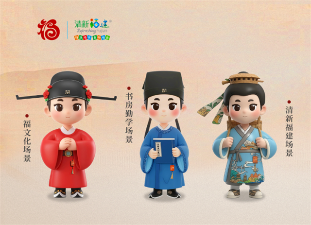 “八闽书房”IP形象以古代书生形象为原型,基于现代人对传统书生的理解与想象,通过现代化、符号化再创作,传递“穿越千年的风雅”,配套有适配于书房勤学、清新福建、福文化三大核心场景的不同服饰,既保留书生的文雅特质,又深度融合福建文旅元素,使闽人闽书闽事闽智慧以生动姿态走进百姓生活。