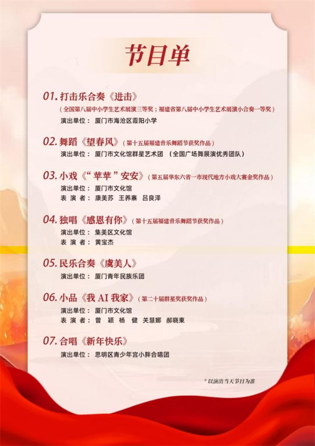 演出汇聚我省群众文艺创作精品,涵盖音乐、舞蹈、戏剧、器乐等多种形式,多部作品曾荣获国家级、省级大奖,温情满满,活力四射!这些作品由群众文艺骨干、文化馆团队、学校团体倾情创演,扎根生活、贴近民心,讲述福建故事,传递时代温度!