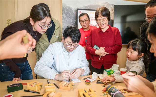 活动现场还设置“福藏石间”寿山石主题图书展,展出《寿山石鉴藏全书》《寿山石人物志》等涵盖寿山石历史文化、品种分类、代表人物等多元题材藏书,让读者们在书页翻阅中探寻寿山石的文化脉络。在书本中汲取理论滋养之后,读者们在青年寿山石雕刻家郑嘉诚的带领下,在一笔一划、一刻一凿间刻下“福”字,这不仅是对传统雕刻技艺的致敬,更是对寿山石雕作为国家级非物质文化遗产所蕴含的工匠精神的体悟。