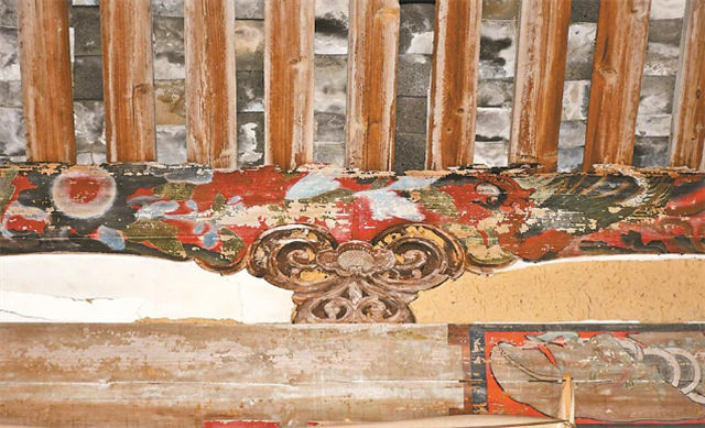 此外,宝峰岩大殿内留有多处精美彩绘,如正殿明间三架梁面层彩绘双狮戏球,五架梁面层彩绘的龙依然清晰,神龛横梁面层由沥粉勾画双龙戏珠,造型活灵活现、栩栩如生。