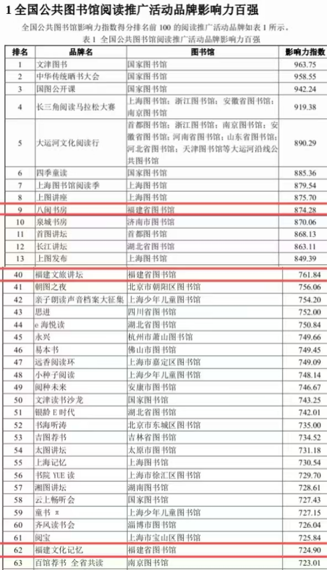 近日,国家图书馆科学评价中心发布《公共图书馆阅读推广活动品牌影响力研究报告2025》,系统评估全国公共图书馆阅读推广品牌影响力。福建省图书馆三大阅读推广品牌从全国534个公共图书馆主办的5300余个候选品牌中脱颖而出入围全国百强:其中“八闽书房”以874.28的影响力指数位列全国第9位,“福建文旅讲坛”“福建文化记忆”分别位列第40、62位。