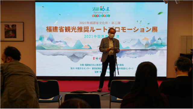 5月25日下午,2021福建文化年“清新福建”“全福游·有全福”福建省精品旅游线路推介活动在东京中国文化中心启动。中国文化中心主任罗玉泉、中国驻东京旅游办事处主任王伟、以及来自日本朝日环球株式会社、大苹果股份公司、世界旅行株式会社、东日观光株式会社、中青旅日本、日本春秋旅行、新大谷酒店、丰岛区日中友好协会、旅行周刊、观光经济新闻社等机构的中外旅游业代表40余人出席了启动仪式。