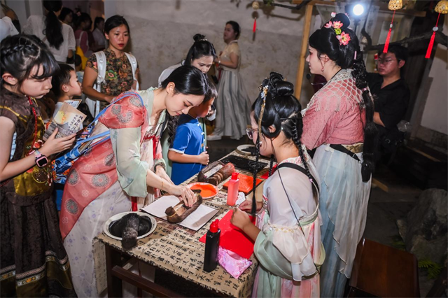 活动中,多个互动环节生动展现闽地中秋的雅趣与民俗。“月下飞花”区内,“门房张大爷”与游客围坐品茶,共诵诗词、讲述民间故事,重现古人“赏月咏怀”的风雅;“投壶赢方”区域则充满欢声笑语,游客在“厨娘”和“小少爷”的引导下体验传统投壶游戏,了解其从礼仪演变为民间娱乐的历史;“灯谜解谜”区前,“教书先生”引导游客破解融入闽地文化的灯谜,在趣味中加深对地方文化的认知;“拓印手作”则让游客亲手制作中秋纪念品,感受传统技艺的温度。