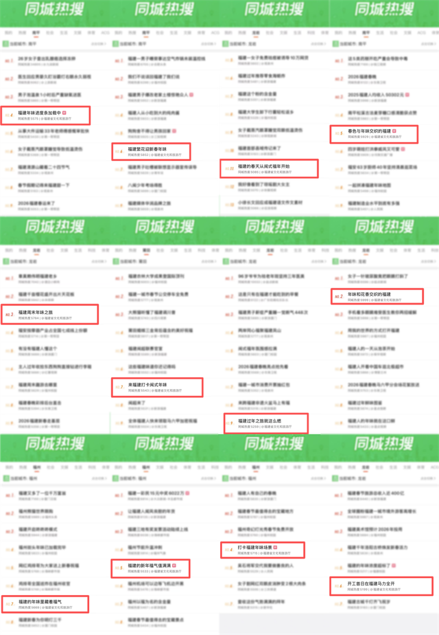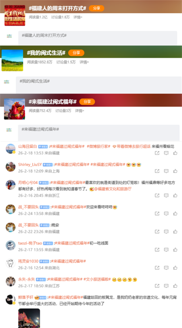 2月,@福建省文化和旅游厅 微博平台围绕“闽式福年”核心话题,有效融合“周末戏相逢”“新春活动”“福建春节玩法”及“赏花攻略”四大主题板块内容,通过热点引导与同城热搜协同运营,共有十二个话题词登上微博同城热搜,有效激发了大家的关注热情,推动内容从“曝光”到“参与”,为各省游客春节来闽热潮贡献一拨宣传能量。据统计,2月1-28日,@福建省文化和旅游厅 共发布微博467条,总阅读量达1835万,转发数有1.8万余次,评论数有1.6万余次,点赞数2.7万次。