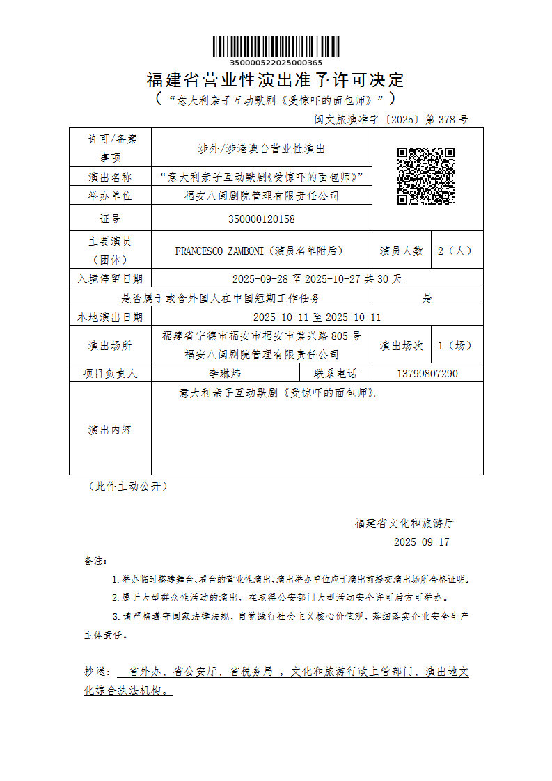 - 文 号: 闽文旅演准字〔2025〕第378号
