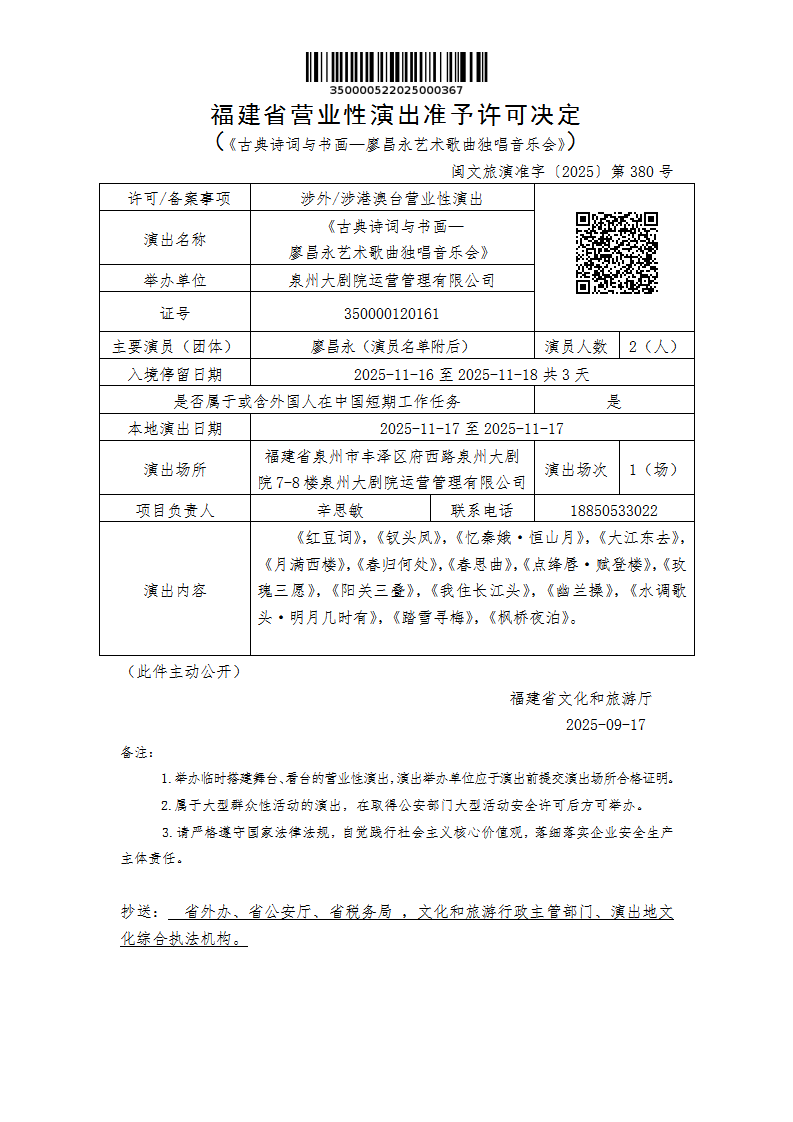 - 内容概述: 福建省营业性演出准予许可决定(《古典诗词与书画—廖昌永艺术歌曲独唱音乐会》)