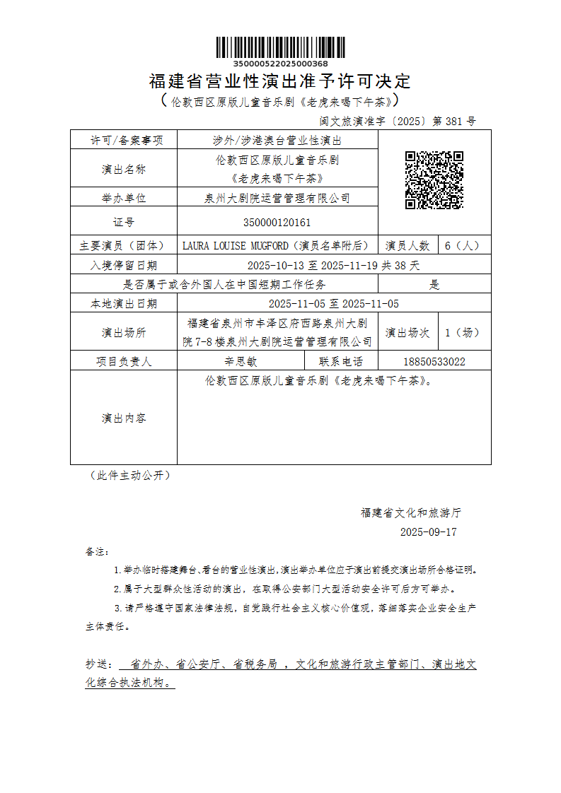 福建省营业性演出准予许可决定(伦敦西区原版儿童音乐剧《老虎来喝下午茶》)