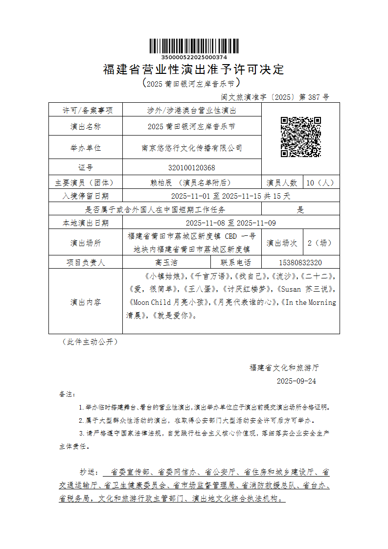 - 文 号: 闽文旅演准字〔2025〕第387号