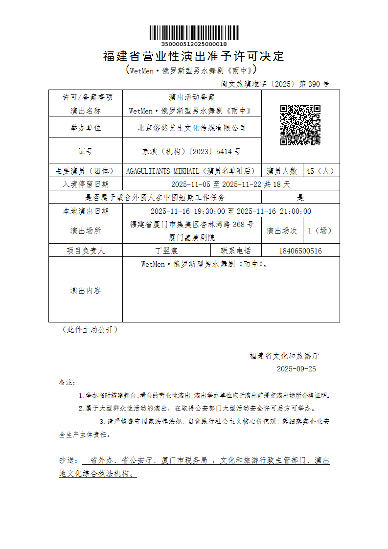 - 文 号: 闽文旅演准字〔2025〕第390号
