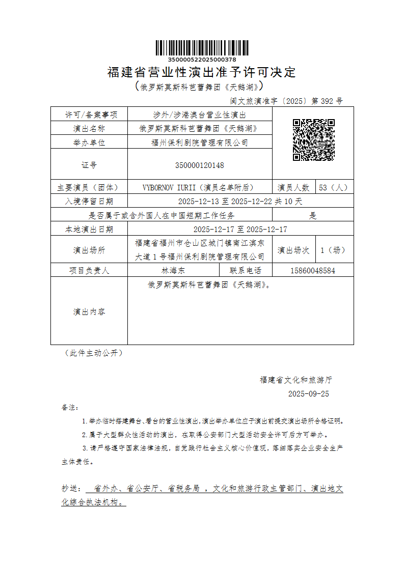 - 文 号: 闽文旅演准字〔2025〕第392号