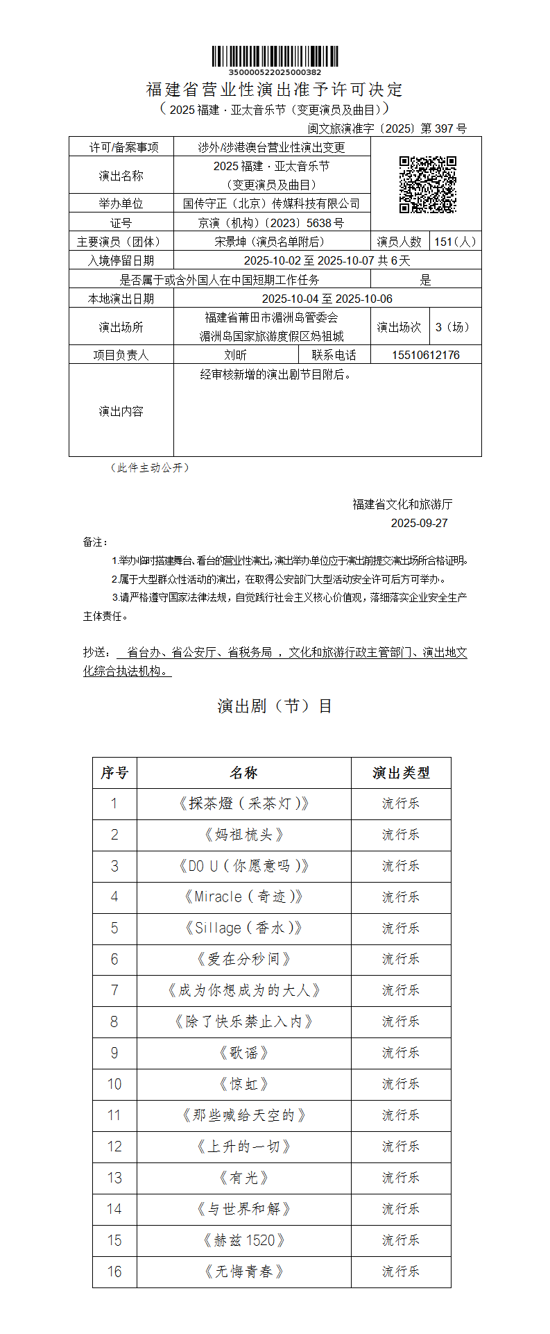 - 文 号: 闽文旅演准字〔2025〕第397号