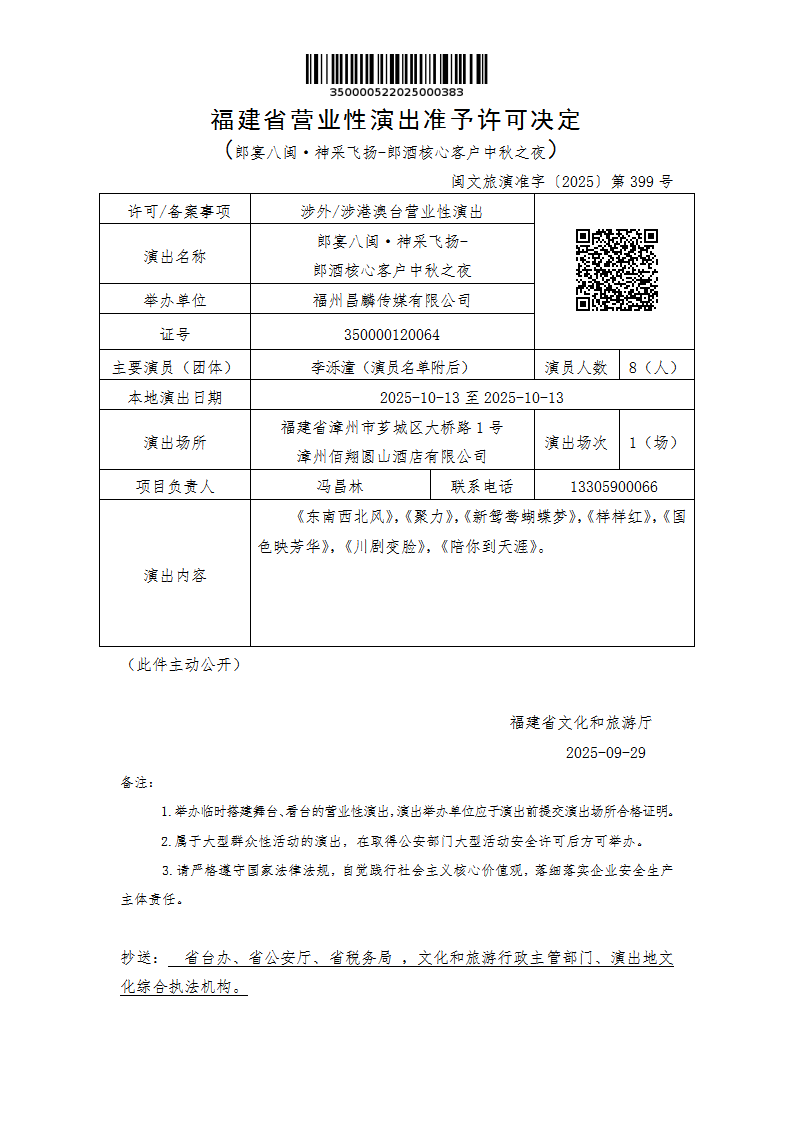 - 文 号: 闽文旅演准字〔2025〕第399号