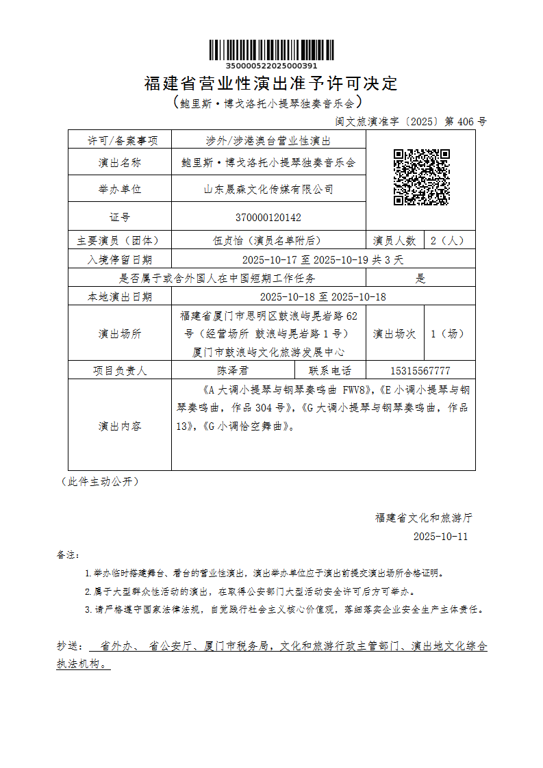 - 文 号: 闽文旅演准字〔2025〕第406号