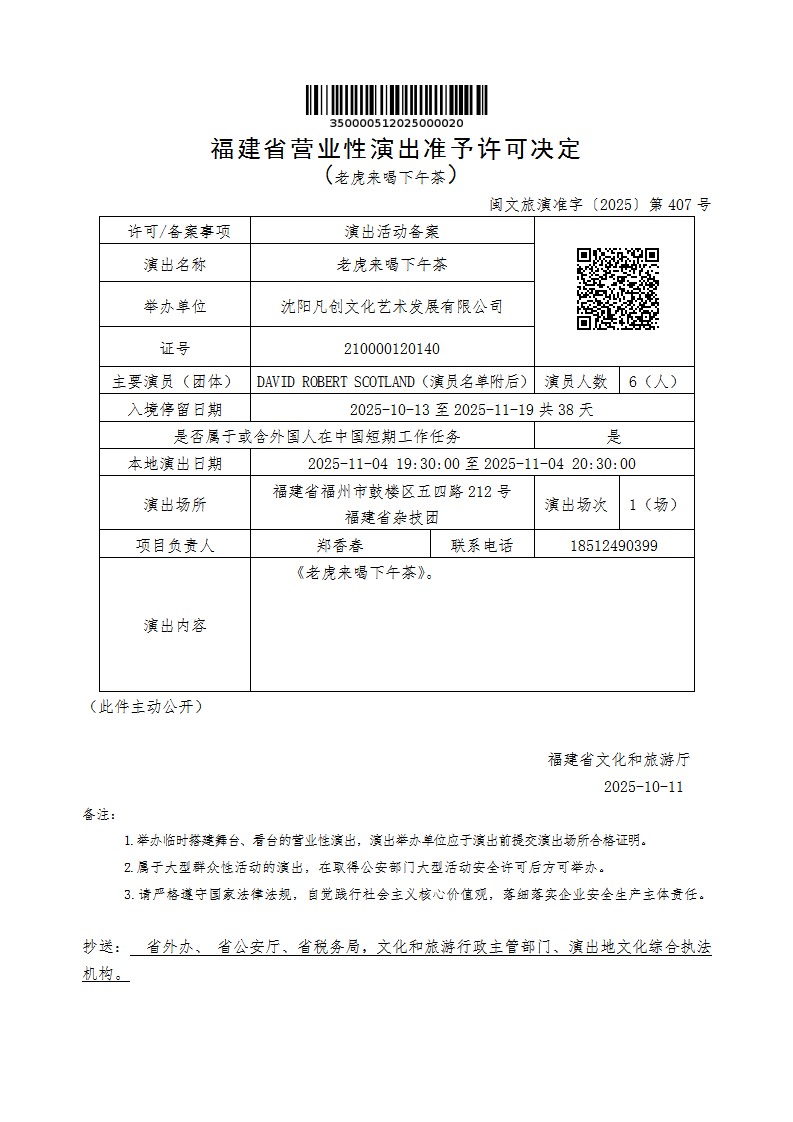 福建省营业性演出准予许可决定(老虎来喝下午茶)