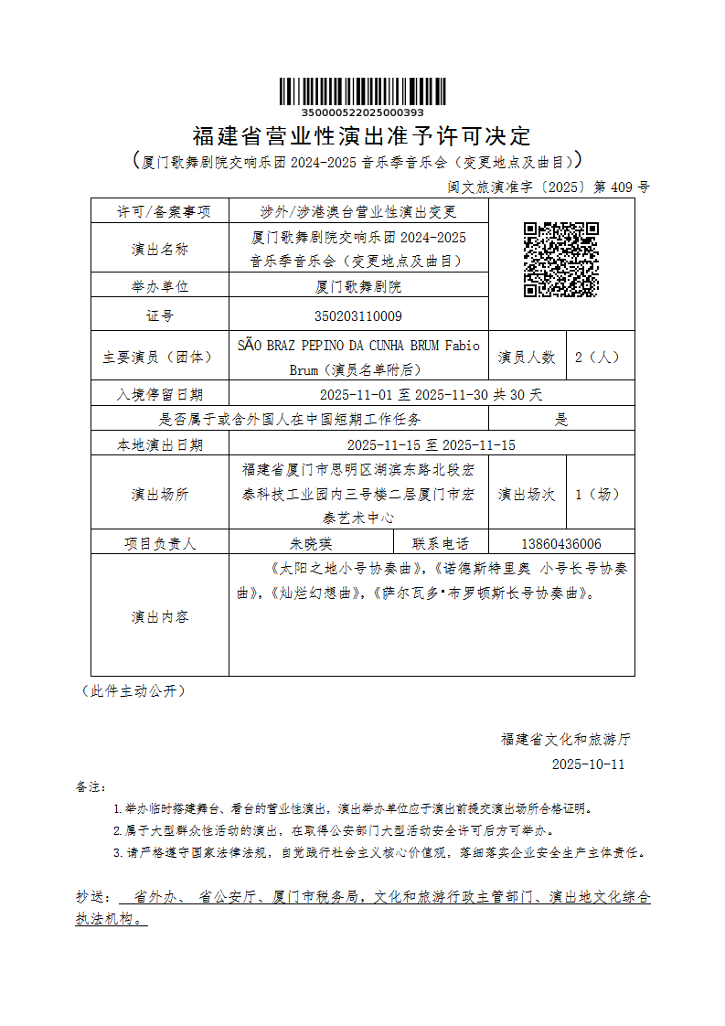- 内容概述: 福建省营业性演出准予许可决定(厦门歌舞剧院交响乐团2024-2025音乐季音乐会(变更地点及曲目))