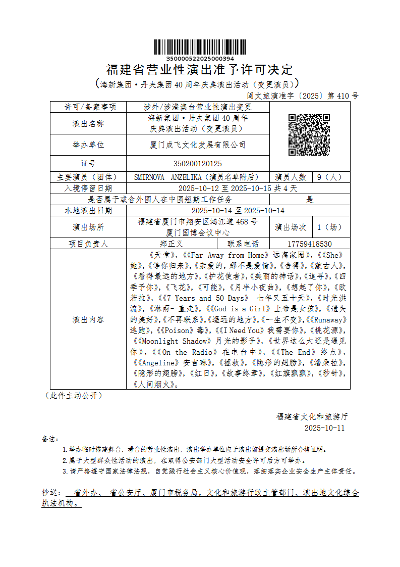 - 文 号: 闽文旅演准字〔2025〕第410号