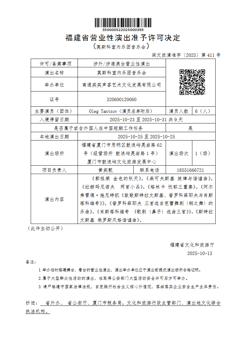 - 文 号: 闽文旅演准字〔2025〕第411号