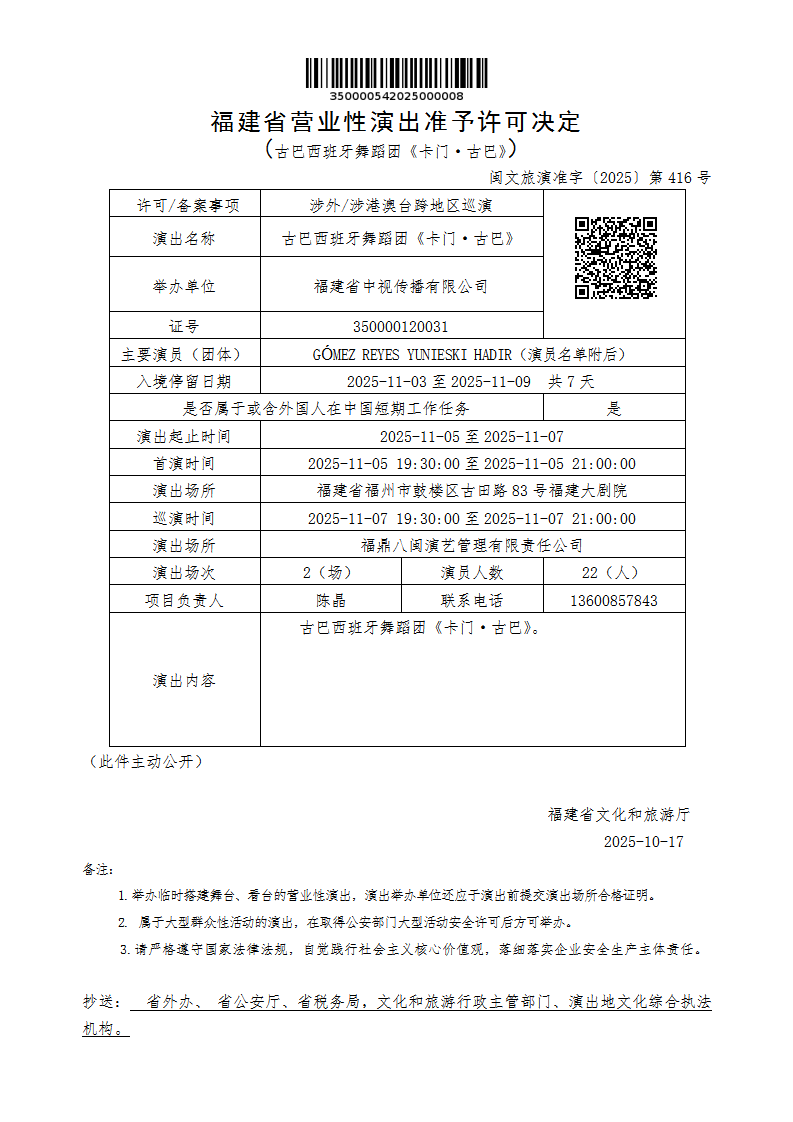 - 文 号: 闽文旅演准字〔2025〕第416号
