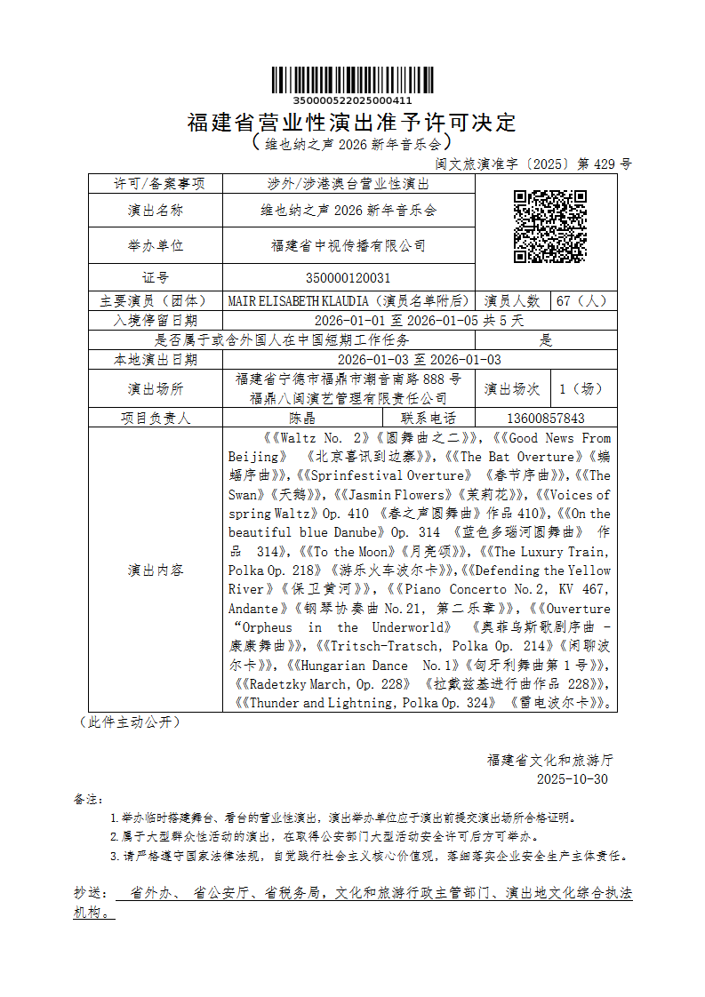 福建省营业性演出准予许可决定(维也纳之声2026新年音乐会)
