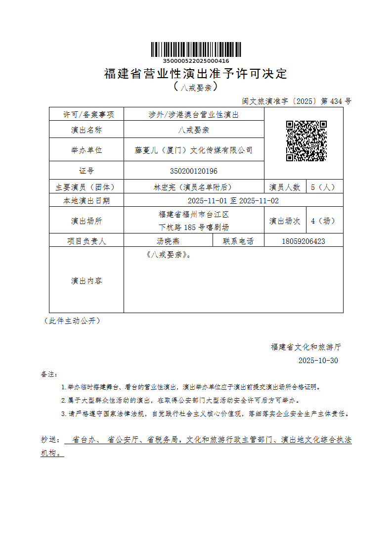 - 文 号: 闽文旅演准字〔2025〕第434号