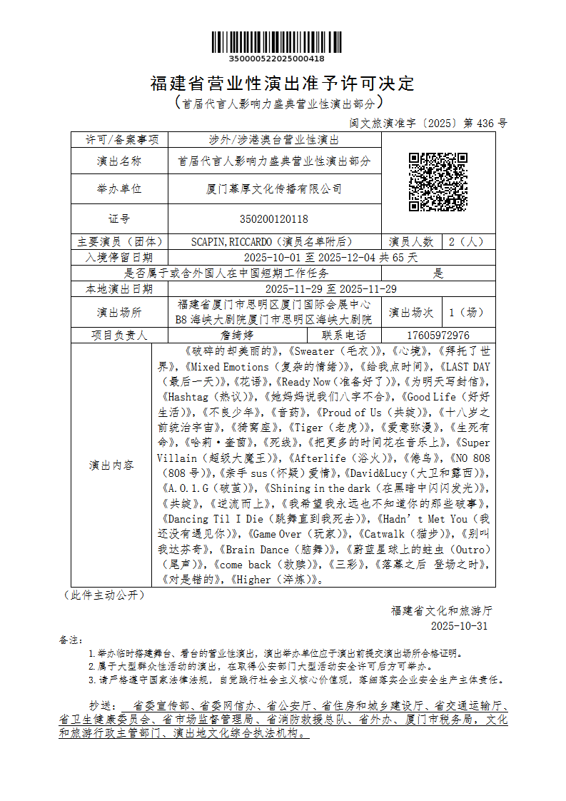 - 文 号: 闽文旅演准字〔2025〕第436号