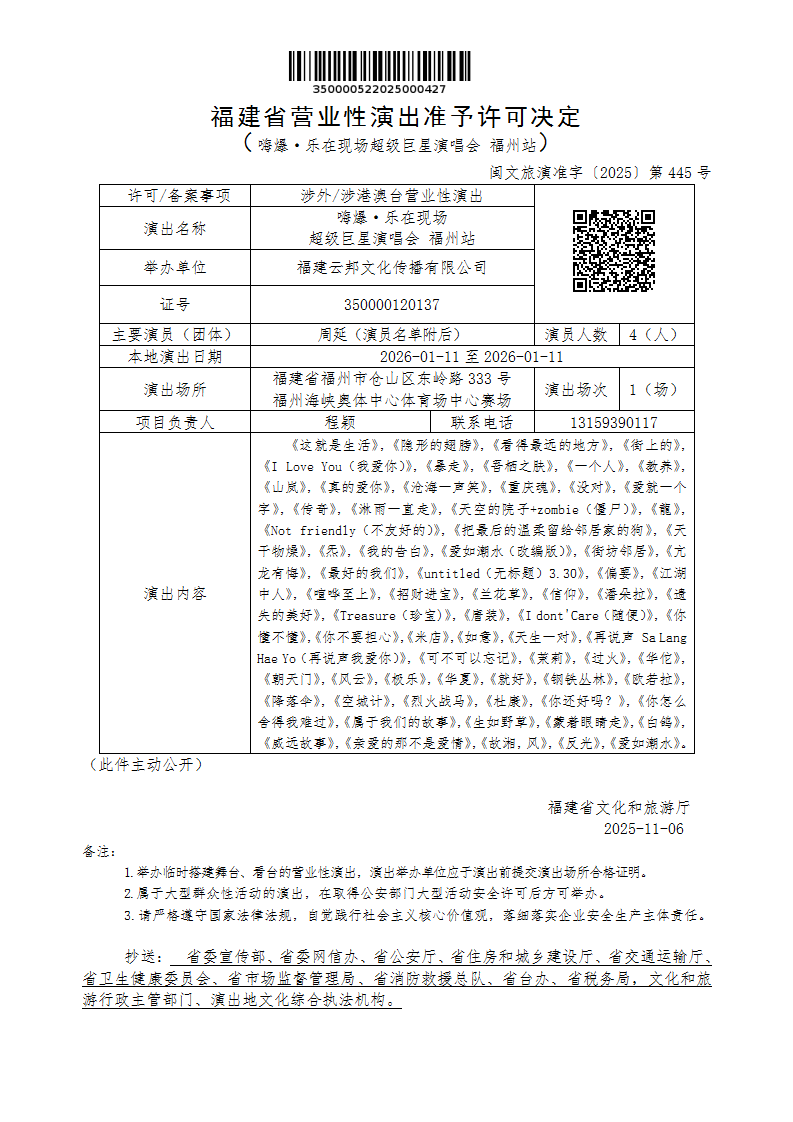 福建省营业性演出准予许可决定(嗨爆·乐在现场超级巨星演唱会 福州站)
