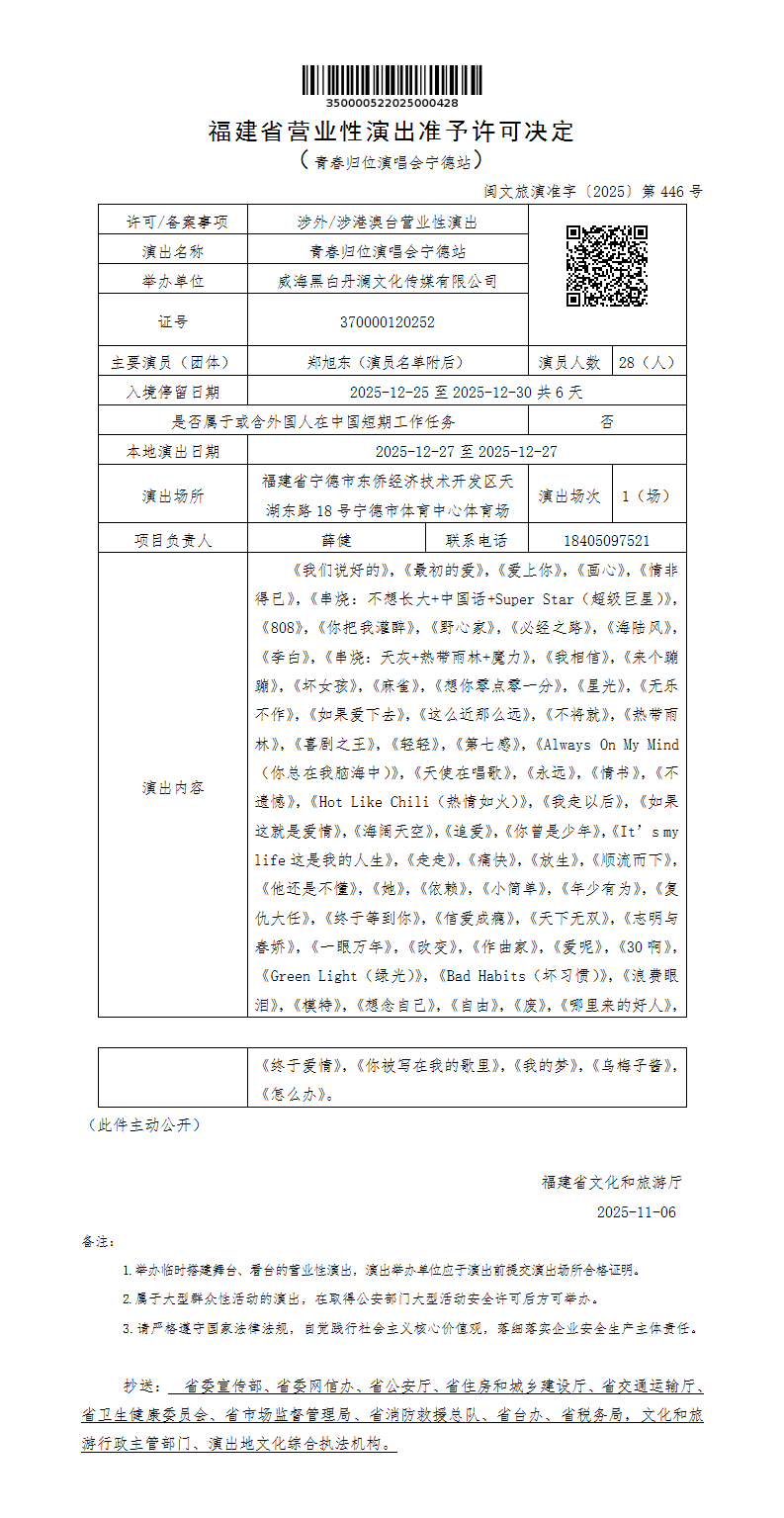福建省营业性演出准予许可决定(青春归位演唱会宁德站)