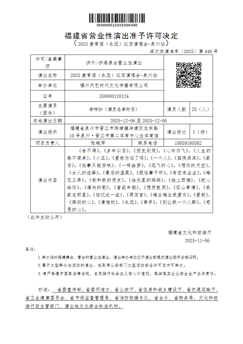 - 文 号: 闽文旅演准字〔2025〕第448号