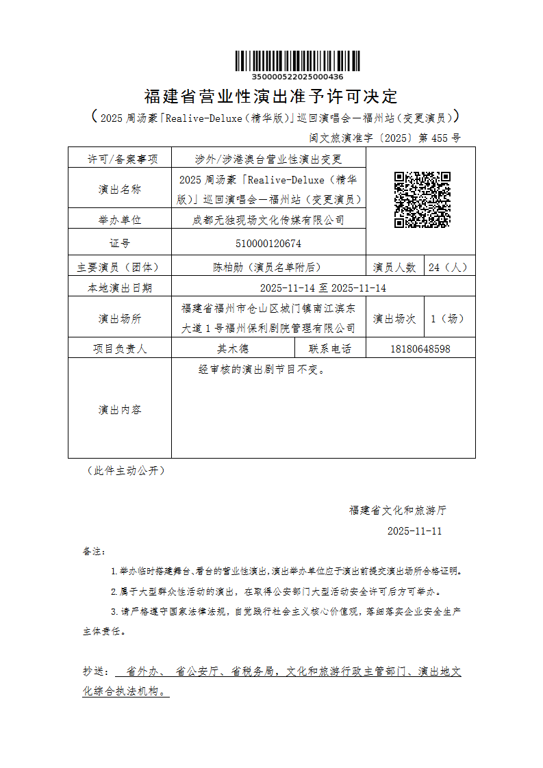 - 内容概述: 福建省营业性演出准予许可决定(2025周汤豪「Realive-Deluxe(精华版)」巡回演唱会-福州站(变更演员))