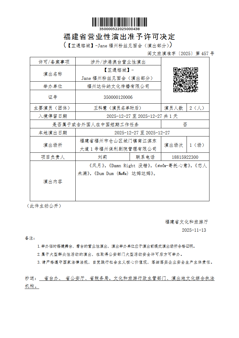 - 内容概述: 福建省营业性演出准予许可决定(【芷遇榕城】-Jane福州粉丝见面会(演出部分))