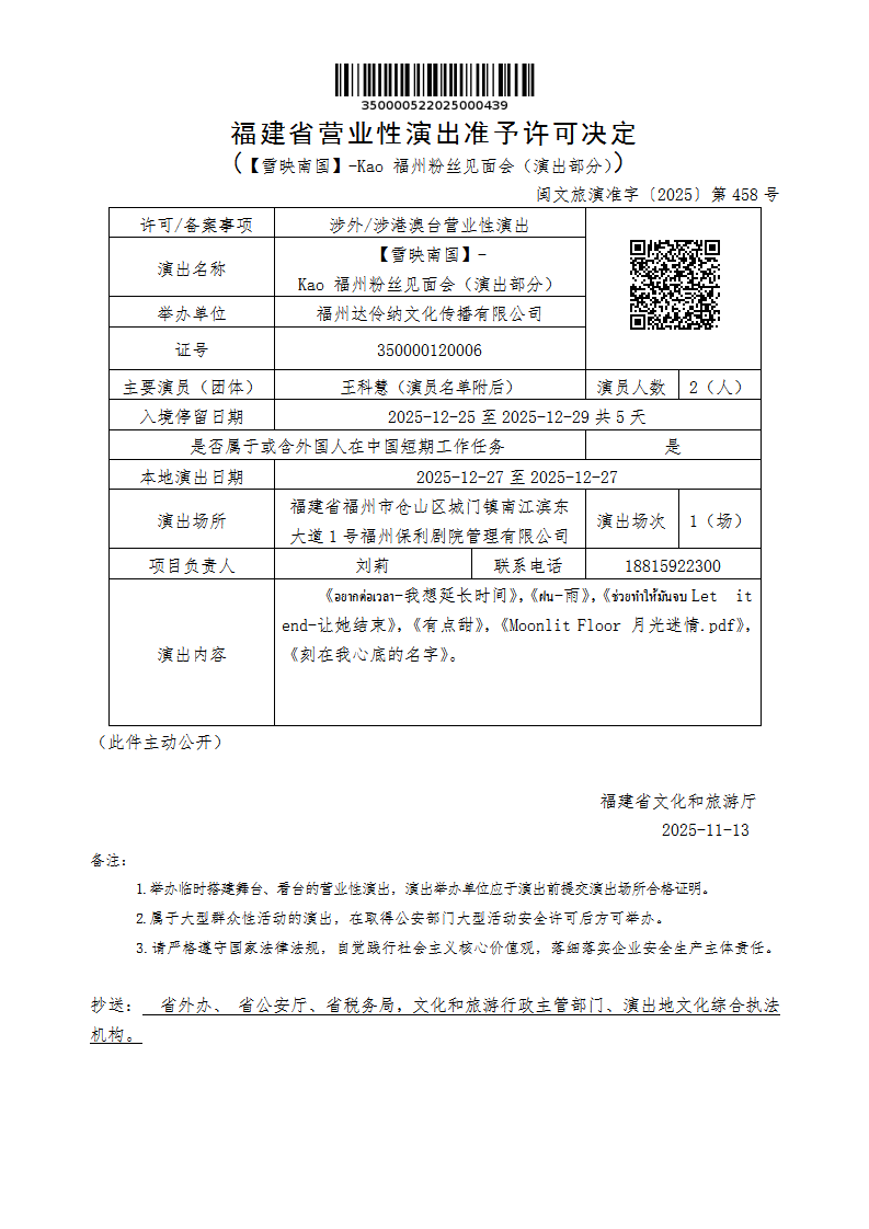 福建省营业性演出准予许可决定(【雪映南国】-Kao 福州粉丝见面会(演出部分))