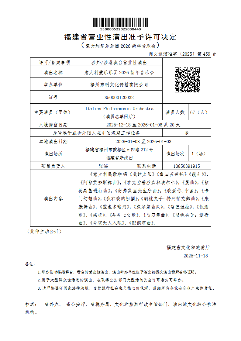 福建省营业性演出准予许可决定(意大利爱乐乐团2026新年音乐会)