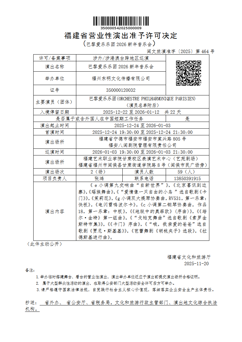福建省营业性演出准予许可决定(巴黎爱乐乐团2026新年音乐会)