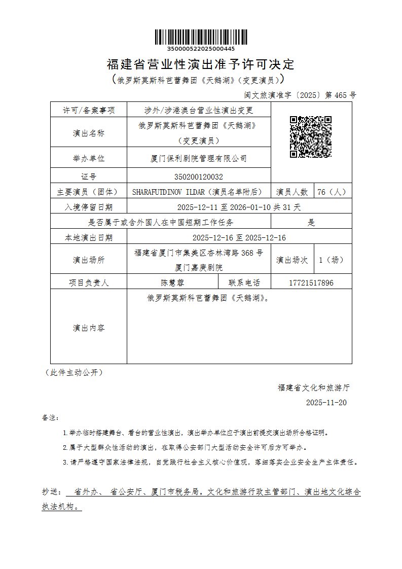 福建省营业性演出准予许可决定(俄罗斯莫斯科芭蕾舞团《天鹅湖》(变更演员))