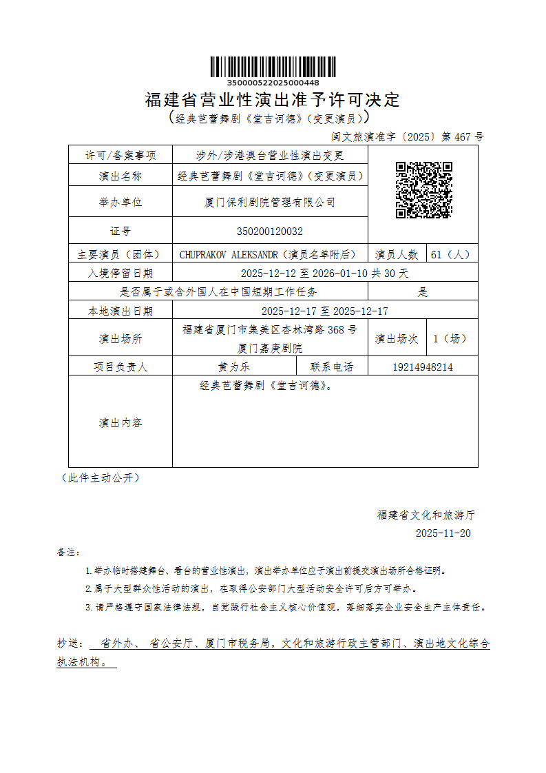 - 文 号: 闽文旅演准字〔2025〕第467号