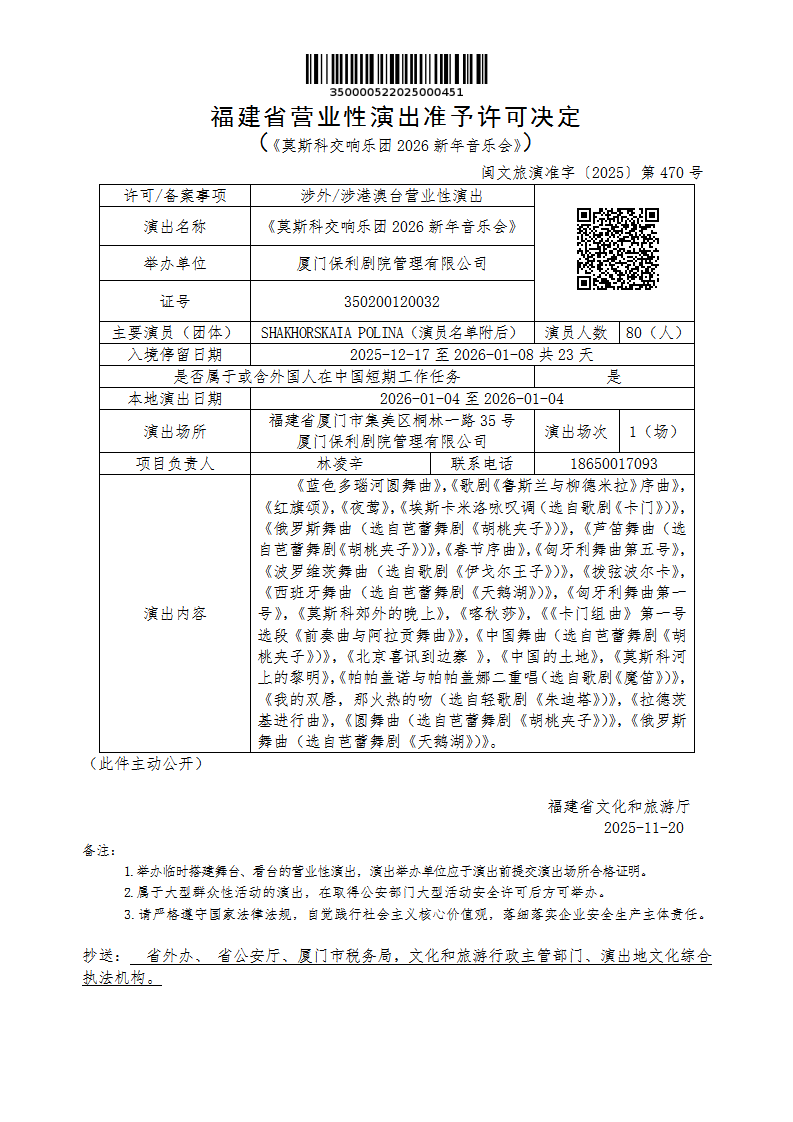 - 内容概述: 福建省营业性演出准予许可决定(《莫斯科交响乐团2026新年音乐会》)