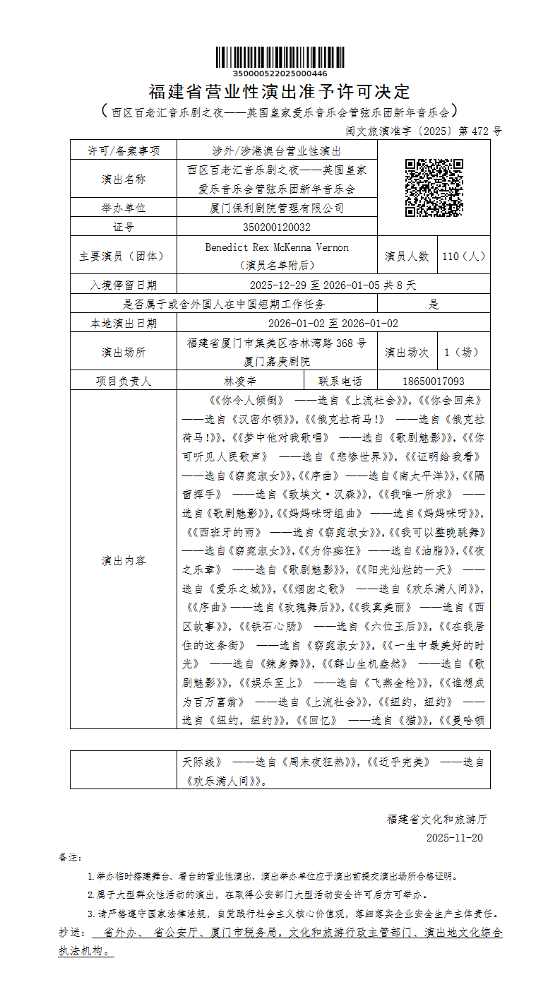 福建省营业性演出准予许可决定(西区百老汇音乐剧之夜——英国皇家爱乐音乐会管弦乐团新年音乐会)