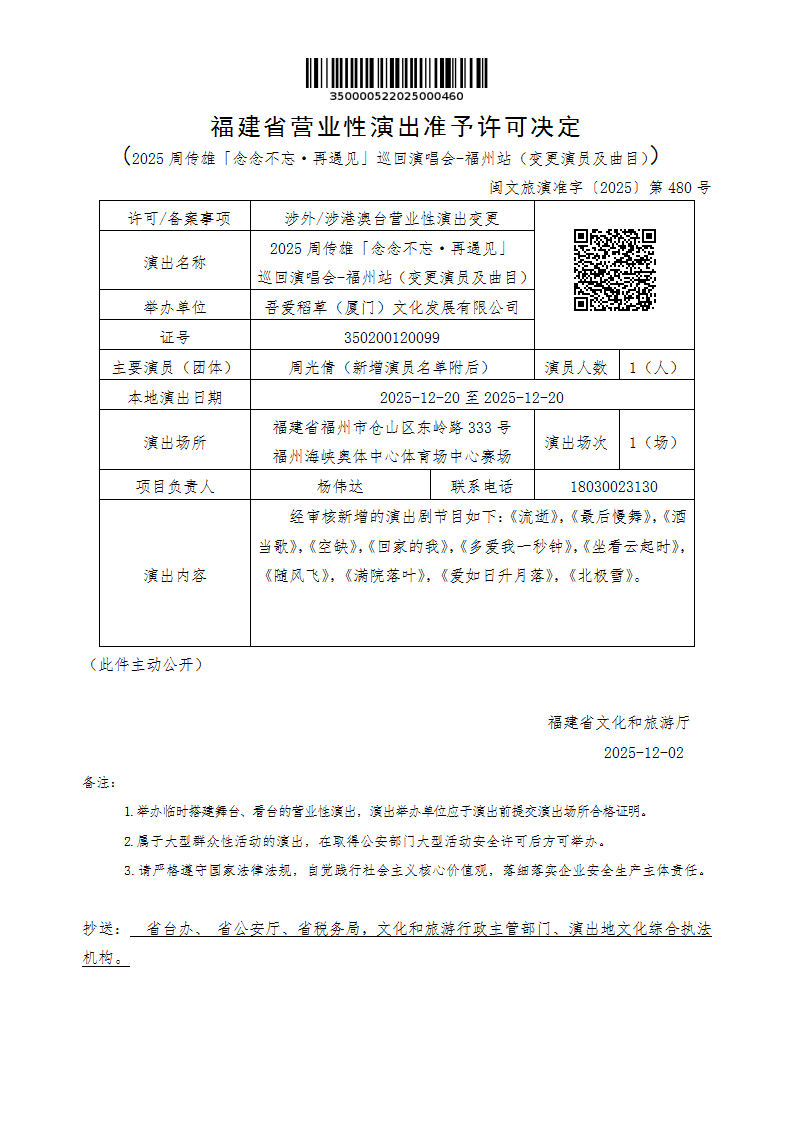 - 内容概述: 福建省营业性演出准予许可决定(2025周传雄「念念不忘·再遇见」巡回演唱会-福州站(变更演员及曲目))