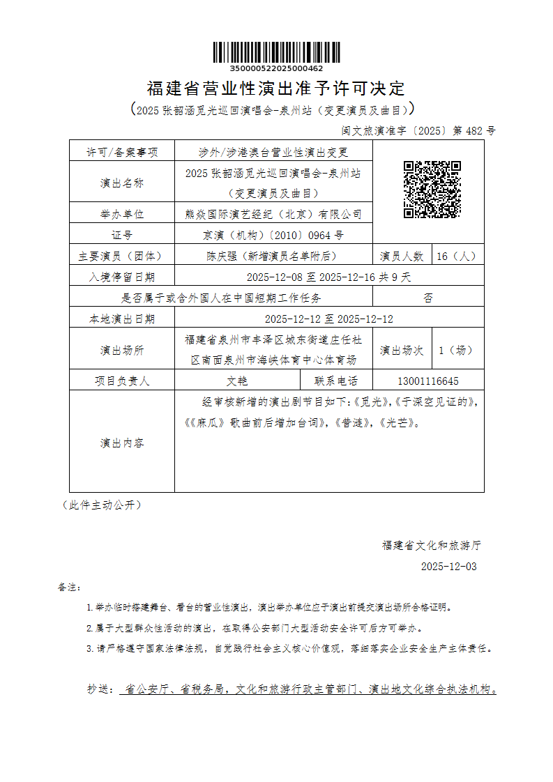 - 内容概述: 福建省营业性演出准予许可决定(2025张韶涵觅光巡回演唱会-泉州站(变更演员及曲目))