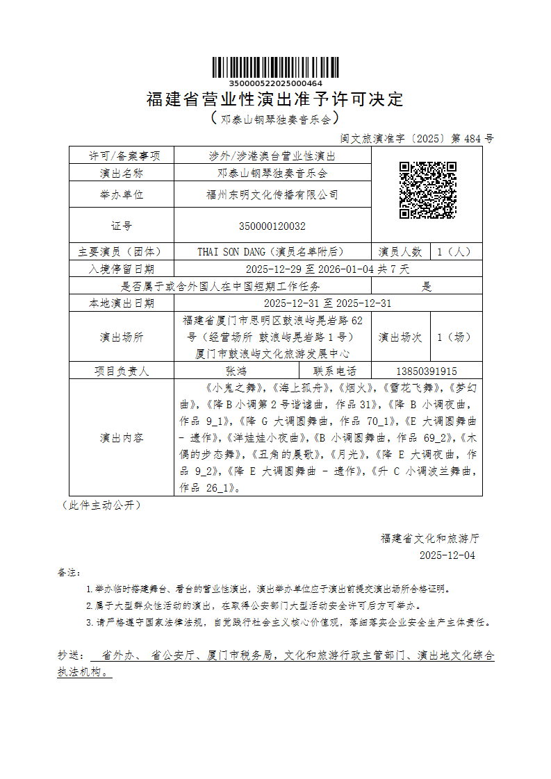 福建省营业性演出准予许可决定(邓泰山钢琴独奏音乐会)