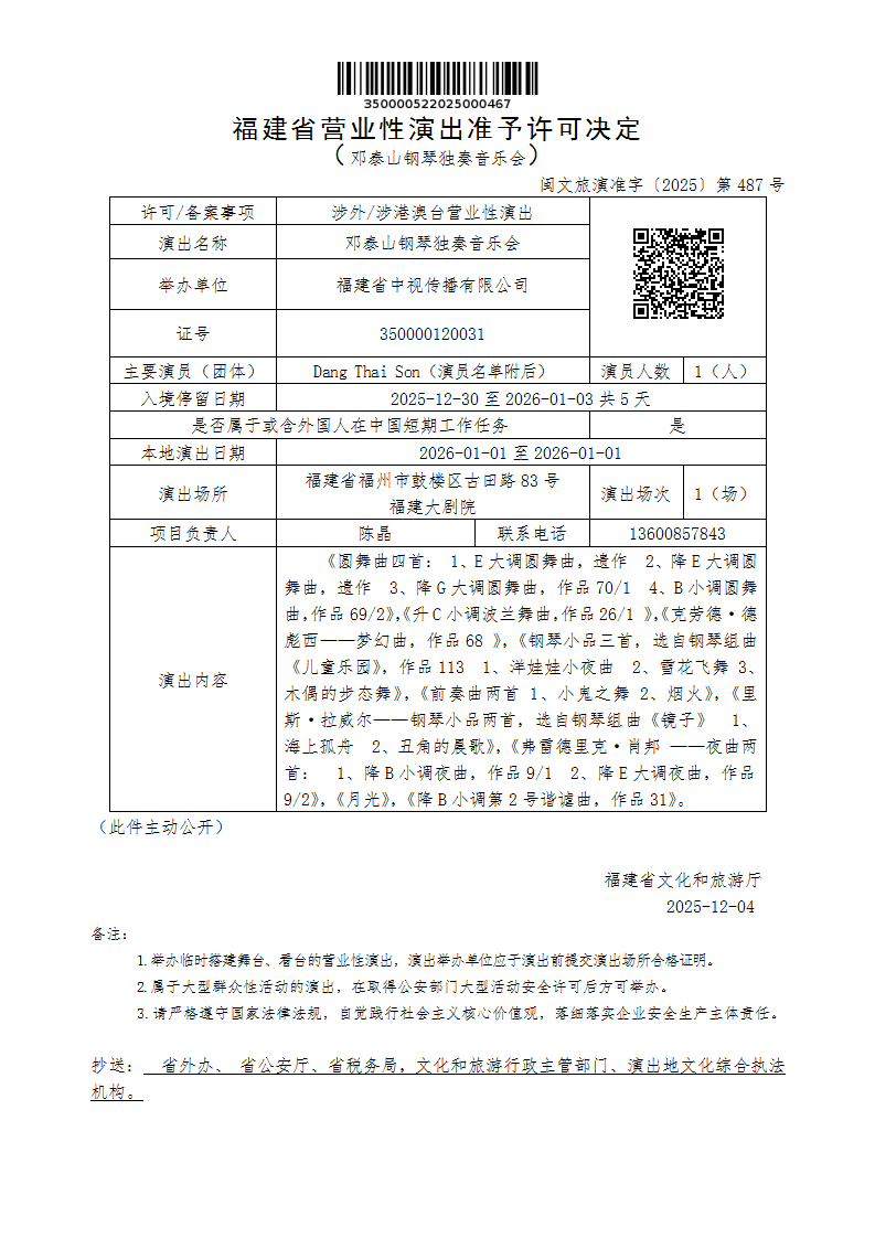 - 内容概述: 福建省营业性演出准予许可决定(邓泰山钢琴独奏音乐会)