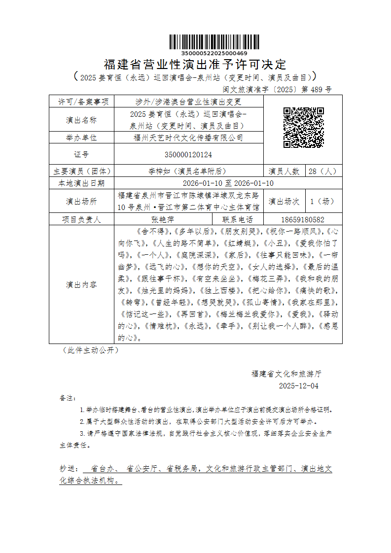 - 内容概述: 福建省营业性演出准予许可决定(2025姜育恒(永远)巡回演唱会-泉州站(变更时间、演员及曲目))